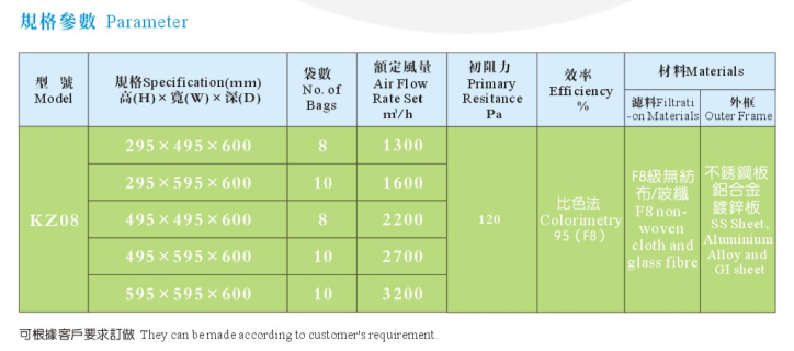本公司采用的濾材為三層濾料均勻熱熔粘合。第一層粗纖維過濾棉捕捉空氣中較大的塵埃,較細的纖維濾紙捕捉空氣中較小的塵埃,最外層無紡布為強化保護層。合理的三層設計使產品具有優良的性能,牢固的熱熔技術避免了風壓產生的泄露,隔網避免了袋與袋之間的貼合,更加細化了送風區域,降低了阻力,并使容塵量達到了最大。